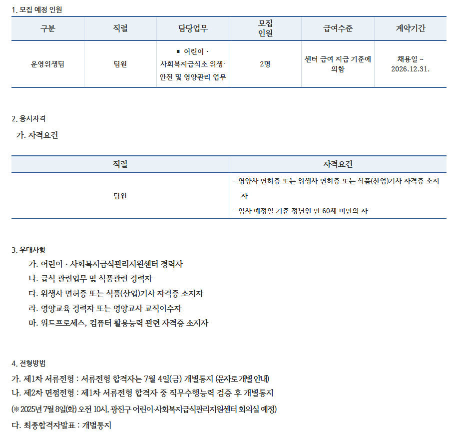 서울특별시 광진구 어린이・사회복지급식관리지원센터 직원(계약직) 채용 공고