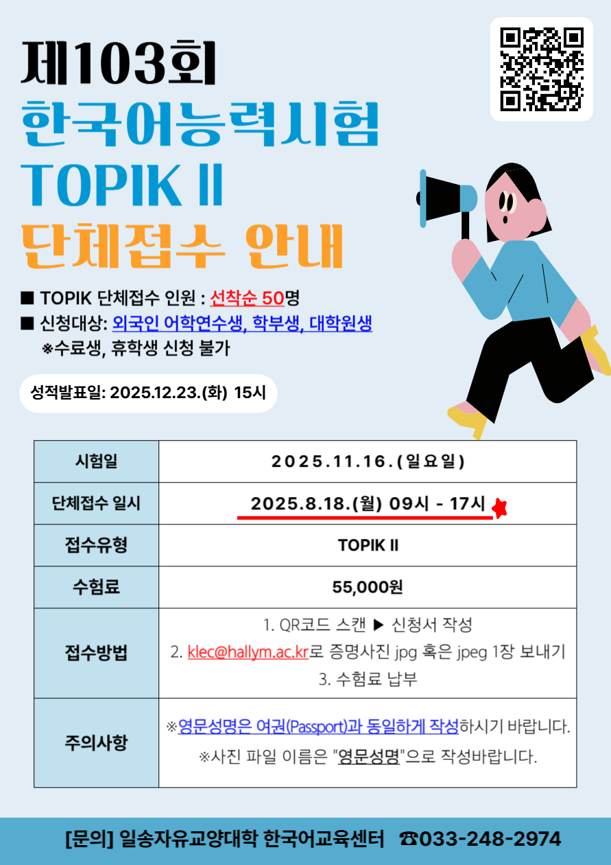 제103회 한국어능력시험(TOPIK) TOPIKⅡ 재학생 단체접수 시행 안내