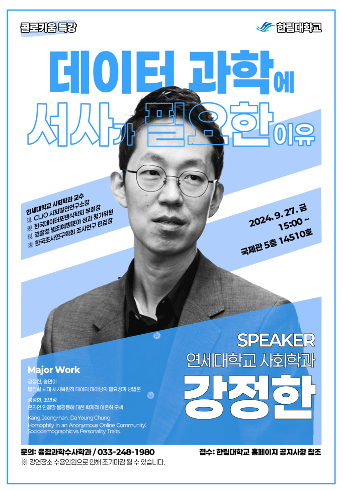 [융합과학수사학과] 콜로키움 특강 09.27(금) '데이터 과학에서 서사가 필요한 이유' 강연