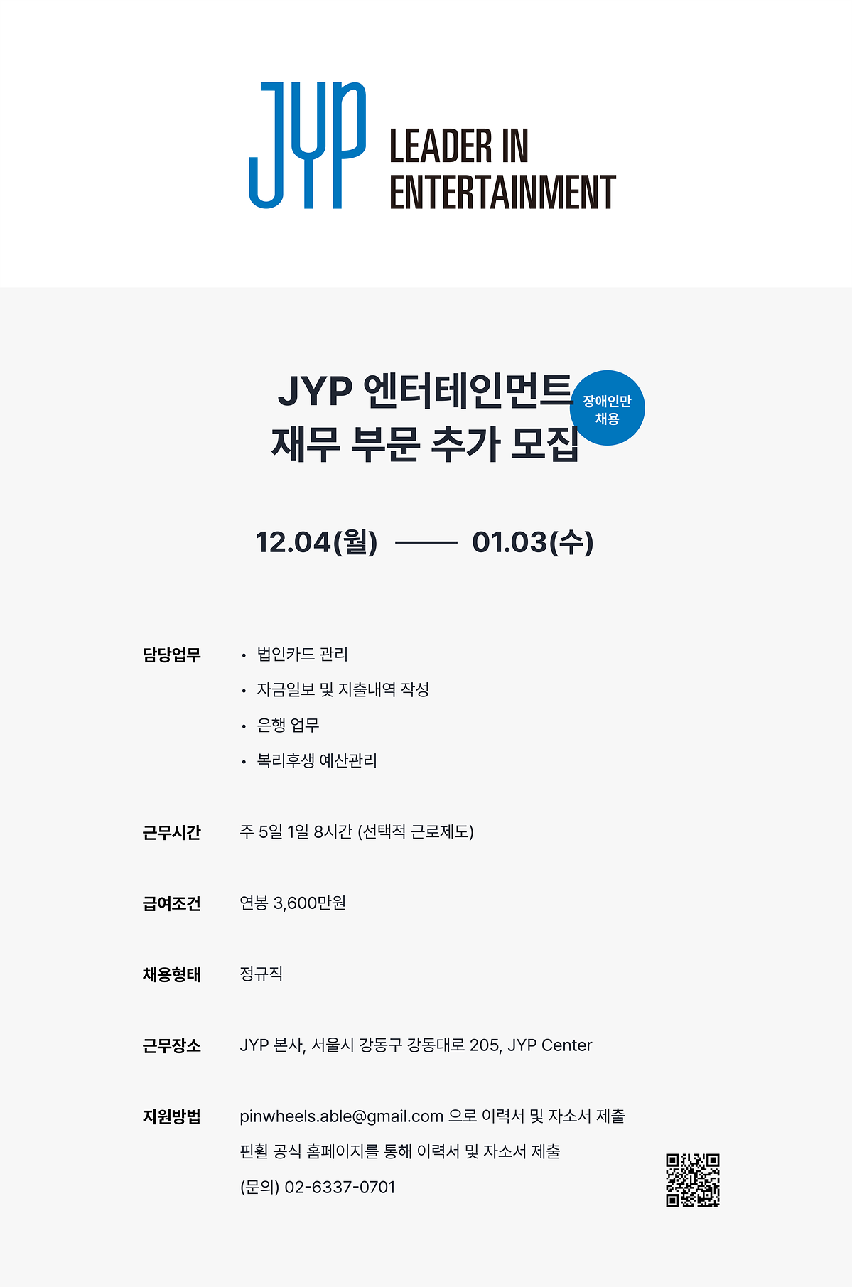 JYP엔터테인먼트 장애인 근로자(재무) 채용 공고